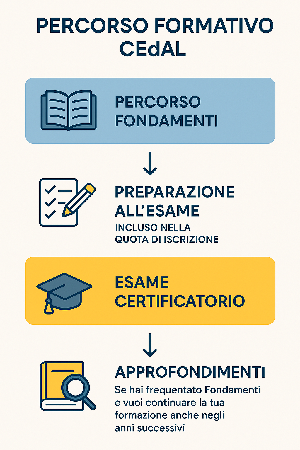 Come posso conseguire la CEdAL? 1) Percorso Diventare un EdAL "Fondamenti": formazione a distanza tutorizzata, per lo più asincrona ma con alcuni momenti in modalità sincrona (almeno il 70% di tutte le attività per ottenere l'attestato) 2) Preparazione all'esame di Certificazione: modulo in autoapprendimento e workshop preparatori tenuti da esperti formatori 3) Due sessioni d'esame tra cui scegliere per sostenere le 5 prove della CEdAL (quattro prove scritte e una orale che si svolgono a distanza in un'unica giornata) |